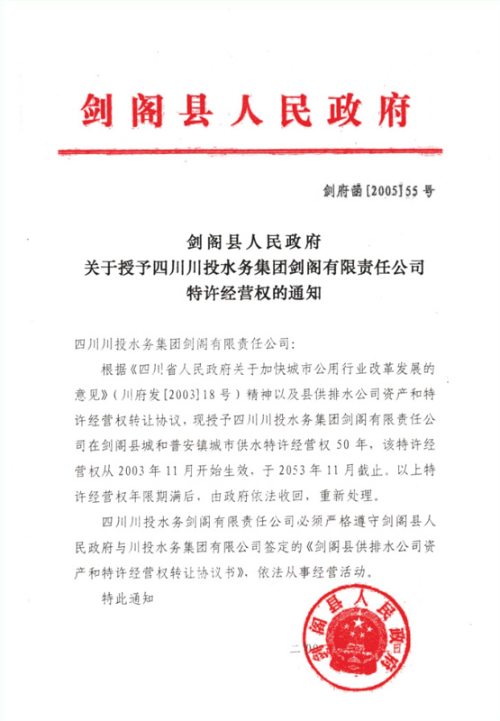 劍閣水司特許經(jīng)營權(quán)