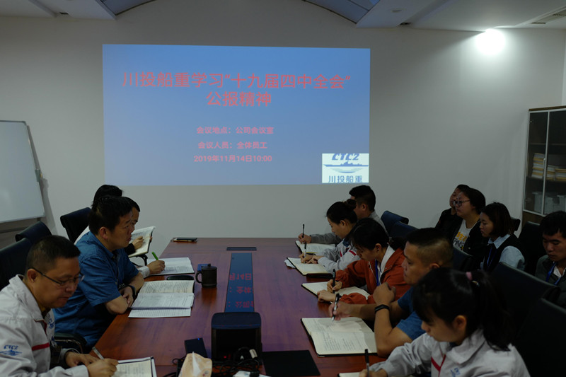 為深入貫徹黨的十九屆四中全會(huì)精神和落實(shí)國(guó)資委對(duì)國(guó)企的要求和部署,川投船重積極響應(yīng),迅速在2019年11月14日上午召開(kāi)公司大會(huì),組織全體員工學(xué)習(xí)習(xí)近平總書(shū)記在黨的十九屆四中全會(huì)中的重要講話及《中共中央關(guān)于堅(jiān)持和完善中國(guó)特色社會(huì)主義制度推進(jìn)國(guó)家治理體系和治理能力現(xiàn)代化若干重大問(wèn)題的決定》全會(huì)等會(huì)議精神。